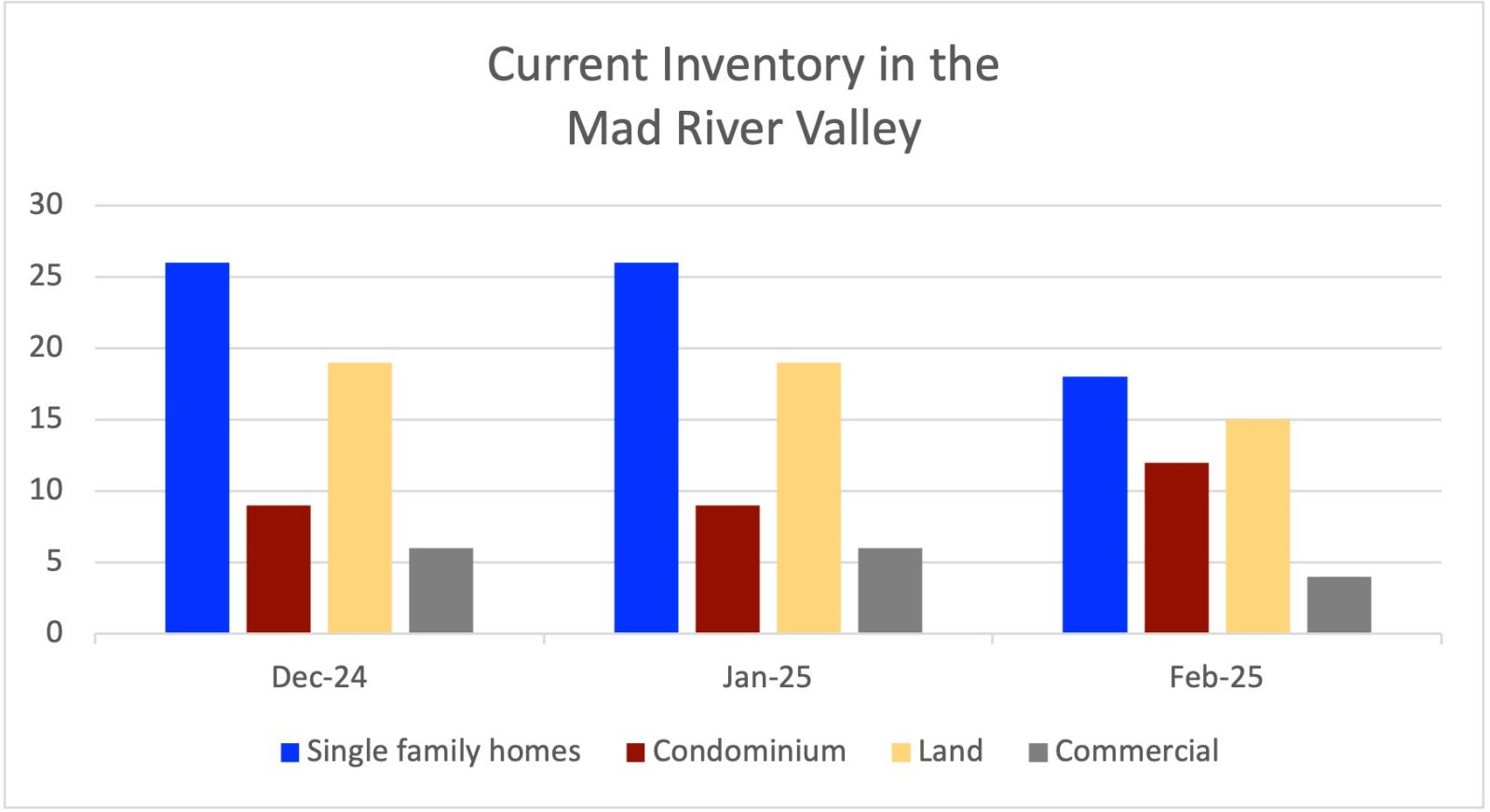 The current inventory in the Mad River Valley is down to 18 single family homes (21 this time last month), there are 12 whole-ownership condominiums (up from 7 this time last month), there are 15 undeveloped land parcels (17 this time last month), and 4 commercial properties (down from 5 last month). The low inventory trend continues with drips and drabs of new listings in each category as the winter progresses.